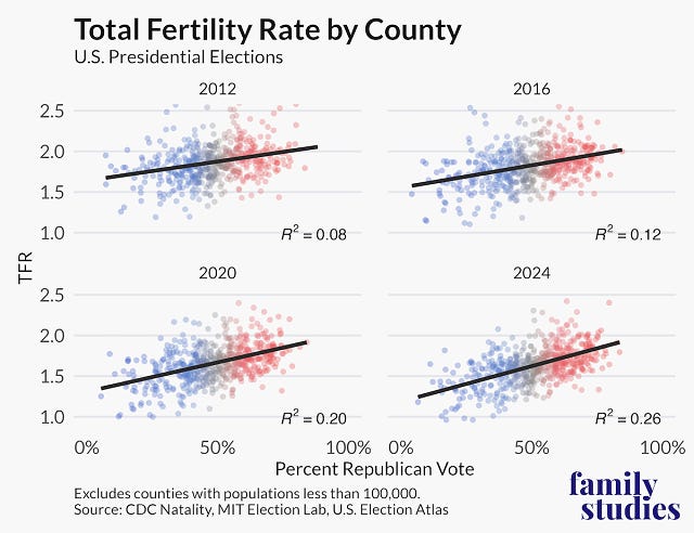 The peak-red counties had ~2 kids/woman in 2012, 2016, 2020, and 2024. But the peak-”blue” counties had ~1.7 in 2012, ~1.6 in 2016, ~1.4 in 2023, and ~1.3 in 2024. The blue-er the county, the more fertility has fallen in the last decade or two.